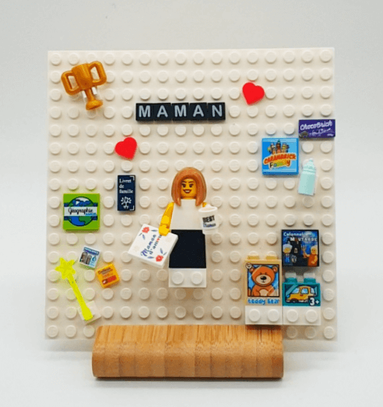 Le kit PIXIE Base Mini : - Une plaque 16x16 studs - marque compatible - Une brique 1x8 studs à clipser à l'arrière pour le maintient - Un support en bois - Un lot de 24 briques spéciales afin de faire tenir jusqu'à 5 figurines et leurs accessoires. - Un de lot de lettres à clipser, jusqu'à 25 lettres pour le titre - Une brique coeur rouge pour la décoration